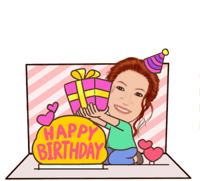 A cheerful woman in a party hat presents a pink gift box with a 'Happy Birthday' sign and hearts.