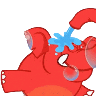 A cheerful red elephant from Galinha Pintadinha sprays water from its trunk, creating playful bubbles as it showers.