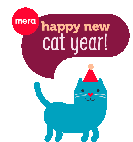 A cute blue cat wearing a party hat celebrates 'Happy New Cat Year!' with the Mera pet brand logo.