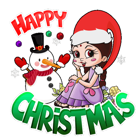 Chutki from Chhota Bheem celebrates Christmas, sitting beside a cheerful snowman with a 'Happy Christmas' greeting.