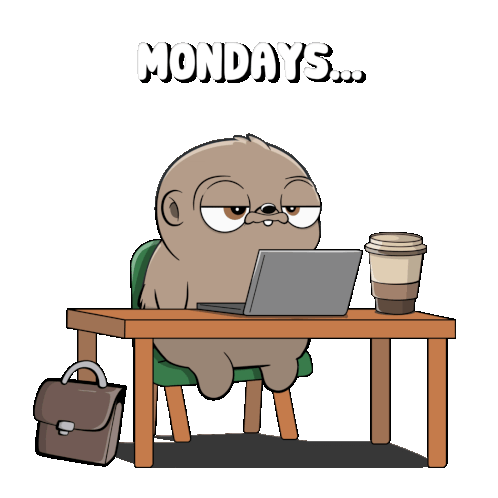 A cute, sleepy sloth character, Derek Fug, sits at a desk with a laptop and coffee, dreading 'MONDAYS...'. Perfect for Monday mood.