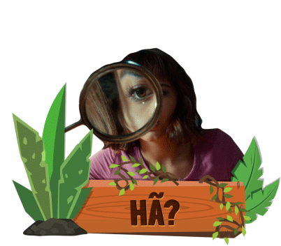 A young woman looks confused while holding a magnifying glass to her eye, with a wooden sign displaying 'Hã?' amidst foliage.