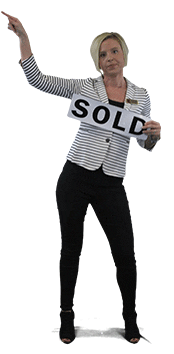 A woman in a striped blazer holds a "SOLD" sign and points downwards, indicating a successful transaction or property sale.