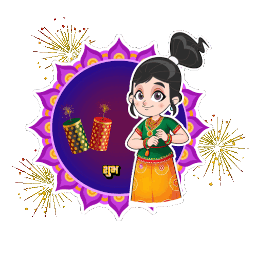A cheerful cartoon girl from Chhota Startup celebrates Diwali with firecrackers and 'Happy Diwali' text in Hindi.