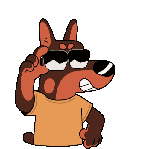 A cool animated dog, possibly a Joberman or Sabaspaniel, adjusts its sunglasses with a happy, confident expression.