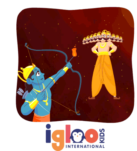 Celebrate Happy Dussehra with this animated sticker featuring Lord Rama aiming at Ravan, symbolizing victory of good over evil.