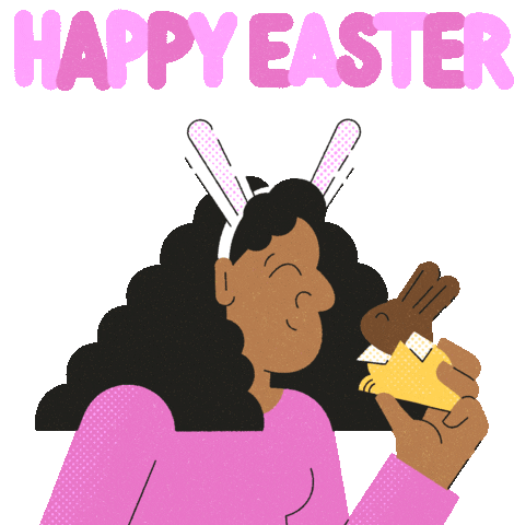 A woman wearing bunny ears celebrates Easter by happily eating a chocolate bunny. Perfect for sharing holiday cheer.