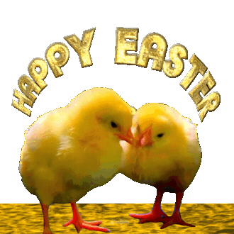 Two adorable yellow chicks appear to kiss under golden 'Happy Easter' text, perfect for holiday greetings.