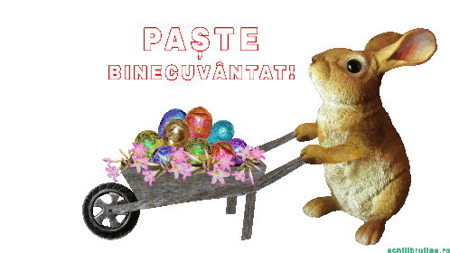 An adorable Easter bunny pushes a wheelbarrow overflowing with colorful eggs and delicate pink flowers, wishing a Blessed Easter.