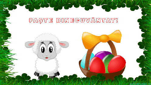 A cute cartoon lamb stands beside a basket of colorful Easter eggs, with "PAȘTE BINECUVÂNTAT!" (Blessed Easter!) text.