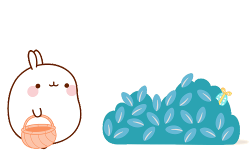 Molang, the adorable chubby bunny, finds a delightful Easter gift in a blue bush, smiling happily with its basket.