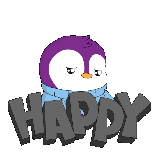 A cute purple Pudgy Penguin happily holds a green fish, with the bold word 'HAPPY' displayed below.