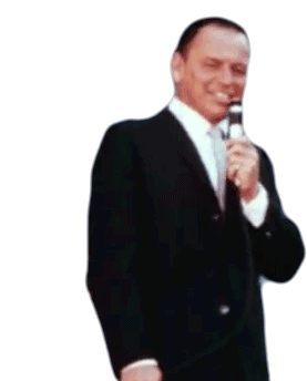 Frank Sinatra, the legendary singer, laughs joyfully while leaning back and holding a microphone, exuding happiness.