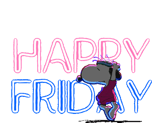 Snoopy joyfully dances to celebrate 'Happy Friday' in this vibrant animated sticker, perfect for weekend excitement.