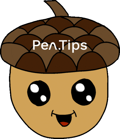A cute and happy cartoon acorn with big eyes and a smile, featuring the 'Pen.Tips' logo on its cap.