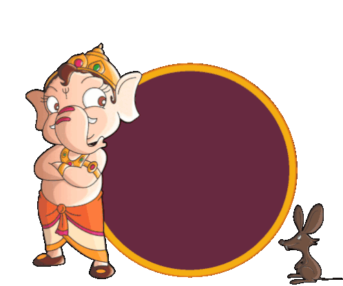 A cheerful animated sticker featuring a cartoon Lord Ganesha and his mouse companion, celebrating Happy Ganesh Chaturthi with vibrant text.