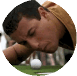 Happy Gilmore, played by Adam Sandler, intensely focuses on a golf ball on the green, showing frustration.