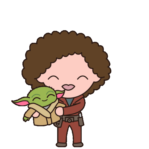 Grogu and Peli Motto share a joyful hug, expressing happiness and affection in this Star Wars sticker.