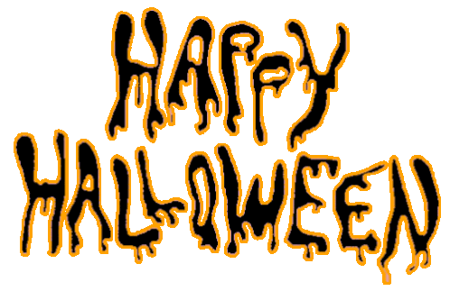Animated 'Happy Halloween' text in orange and black, featuring dripping and leaking effects for a spooky greeting.