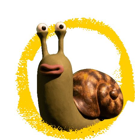 A charming claymation snail character expresses happiness and says hello with a wide smile and open eyes, surrounded by a yellow circle.