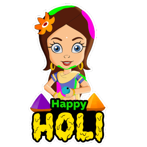 Princess Indumati celebrates Happy Holi, holding a pichkari and surrounded by colorful gulal, ready for the festival of colors.