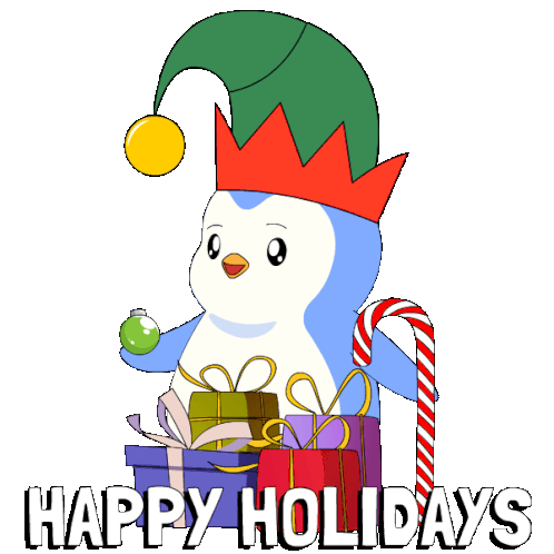 a penguin wearing an elf hat is holding a christmas ball and a candy cane with the words happy holidays written below it