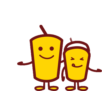 Two adorable Happy Lemon Dubai milktea cartoon cups, one big and smiling, the other small, winking and licking its lips.