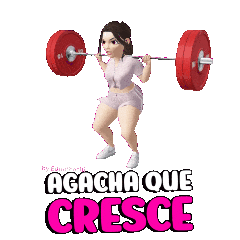 Animated sticker of a cartoon girl doing squats with a barbell, featuring the Portuguese phrase 'Agacha Que Cresce' (Squat So It Grows).