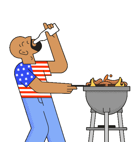 Man in an American flag shirt enjoys Memorial Day, drinking from a bottle while grilling burgers and sausages.