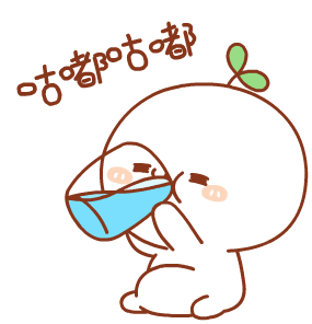 Adorable white cartoon character with a green leaf on its head sits and drinks from a blue cup, making 'gulp gulp' sounds.
