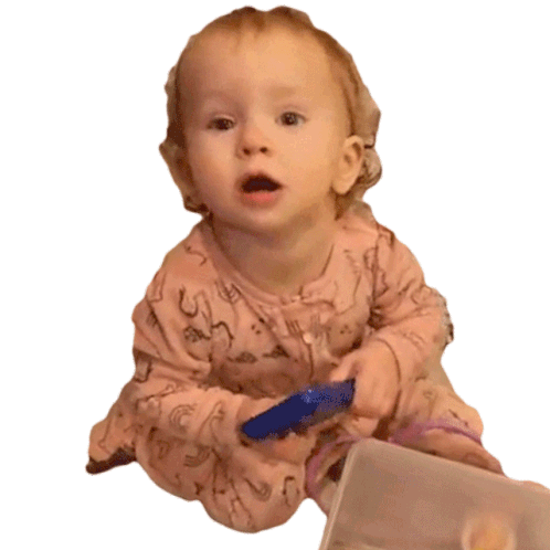 Millie Crosby, a cute baby, looks surprised and happy while holding a blue toy, smiling brightly.