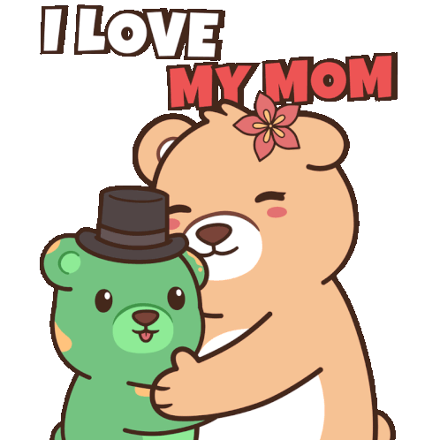 A heartwarming animated sticker of a large bear hugging a smaller bear, with the text 'I LOVE MY MOM'.