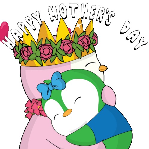 A pink Pudgy penguin wearing a crown and flower wreath hugs a smaller green penguin, with 'Happy Mother's Day' text.