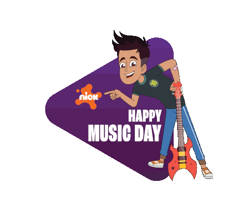 a cartoon drawing of a boy holding a guitar with the words happy music day below him
