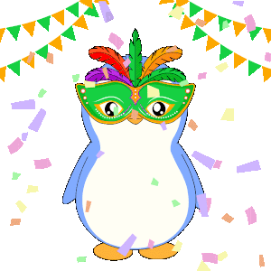a penguin wearing a carnival mask with feathers on it