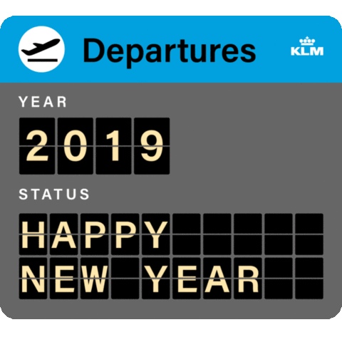 An airport departures board shows "YEAR 2018" and "READY FOR DEPARTURE", themed for Happy New Year 2019.