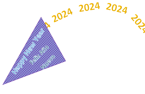 A vibrant purple triangle with 'Happy New Year' and 'Feliz Año Nuevo' text, celebrating 2024.