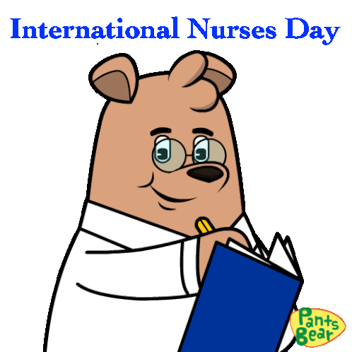 Pants Bear, wearing a lab coat and glasses, celebrates International Nurses Day while holding a book. A warm tribute to nurses.