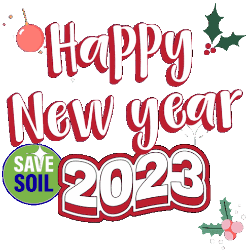 Celebrate 2023 with a festive Happy New Year greeting, featuring holiday decorations and a 'Save Soil' message.