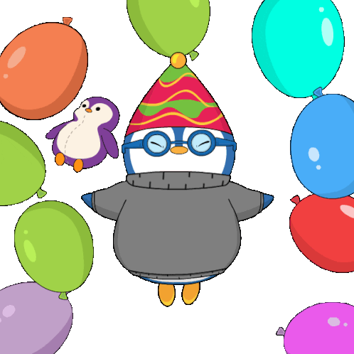 A joyful Pudgy Penguin in a festive hat and glasses is surrounded by a multitude of colorful balloons, celebrating happily.