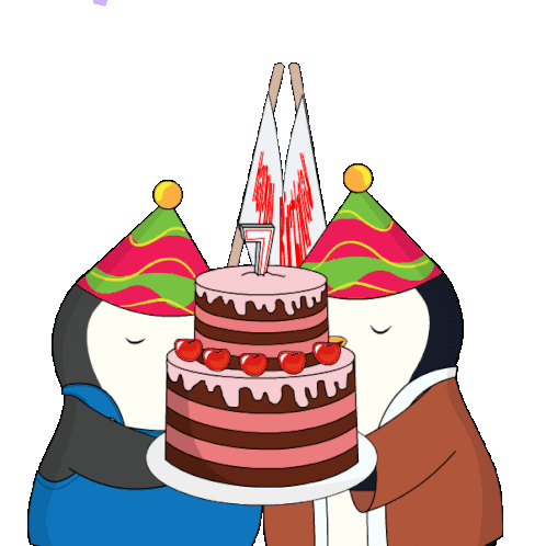 Two cute penguins in party hats celebrate a 7th birthday with a two-tier cake and falling confetti.