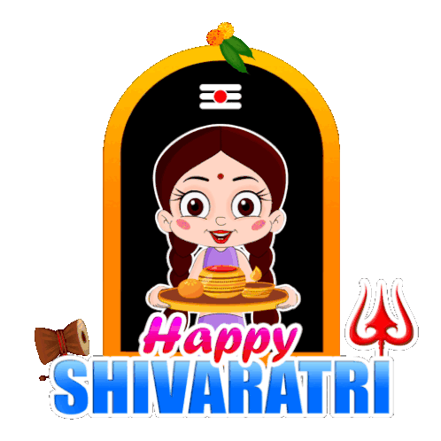 Chutki celebrates Happy Shivaratri, holding offerings before a shrine with Shiva symbols.