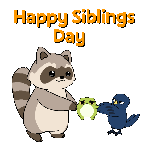A cute raccoon and a crow hold a frog together, celebrating Happy Siblings Day with a playful tug-of-war.