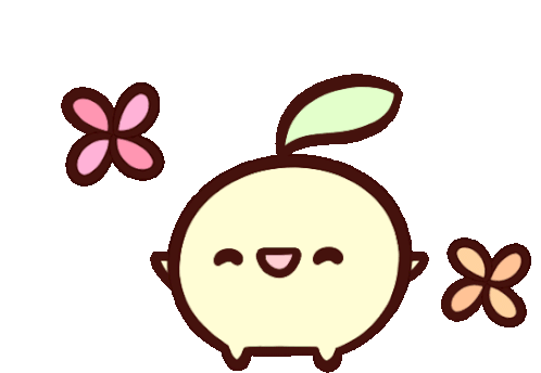 A cute, round, light yellow cartoon character with a green leaf on its head smiles happily, surrounded by pink flowers.