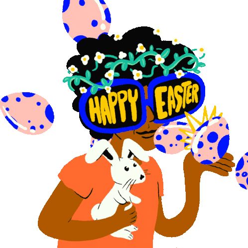 A vibrant sticker celebrating Happy Easter and diversity, featuring a Black woman with bunny ears, 'Happy Easter' sunglasses, and colorful eggs.
