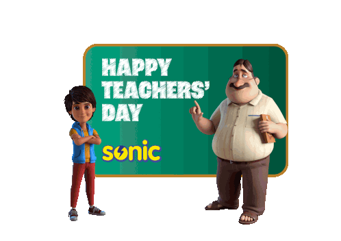 two cartoon characters standing in front of a sign that says " happy teachers day "