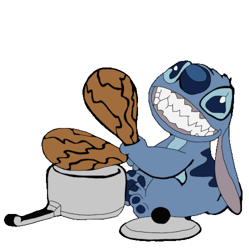 Stitch from Disney's Lilo & Stitch celebrates Thanksgiving, holding a turkey leg with 'Happy Turkey Day' text.