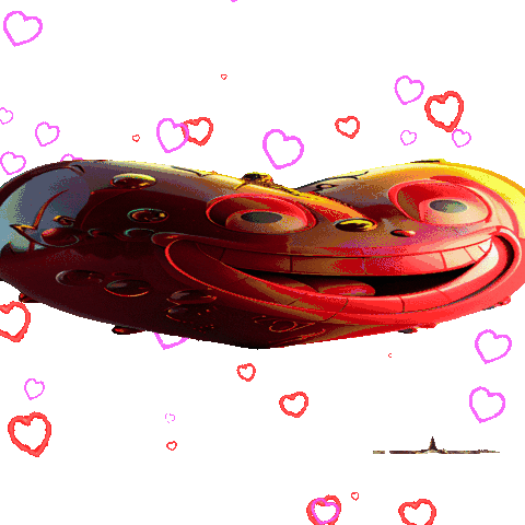 A vibrant, smiling heart transforms into a psychedelic creature, surrounded by floating hearts and pineapples, conveying an "I love you" message.