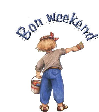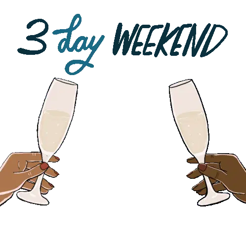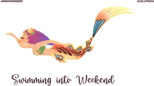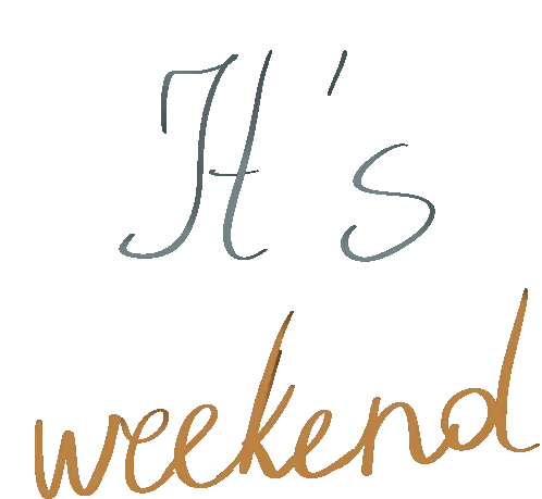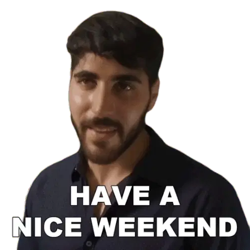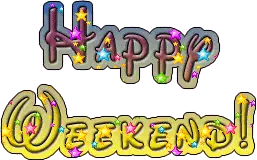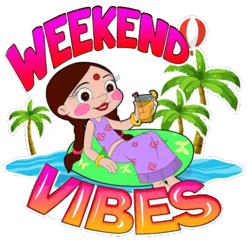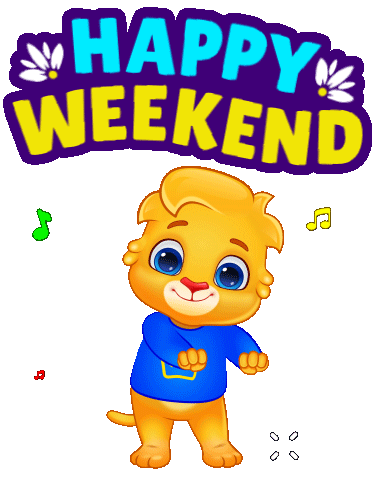 A cheerful cartoon character with blue eyes and orange fur dances happily under a vibrant 'Happy Weekend' sign, spreading joy.