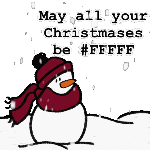 A cheerful snowman in a red scarf and hat stands in the snow, wishing "May all your Christmases be #FFFFFF".